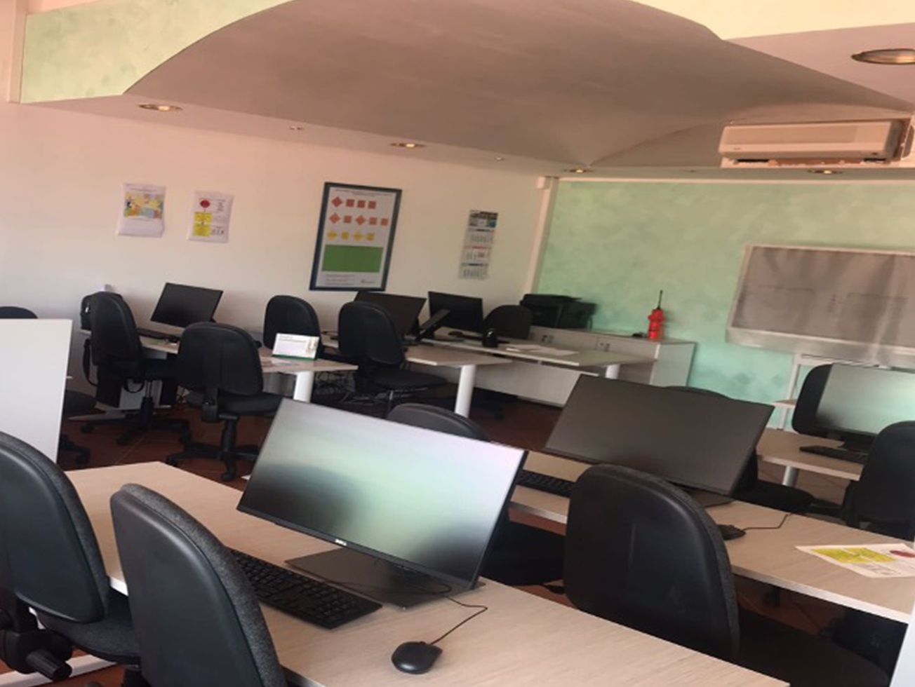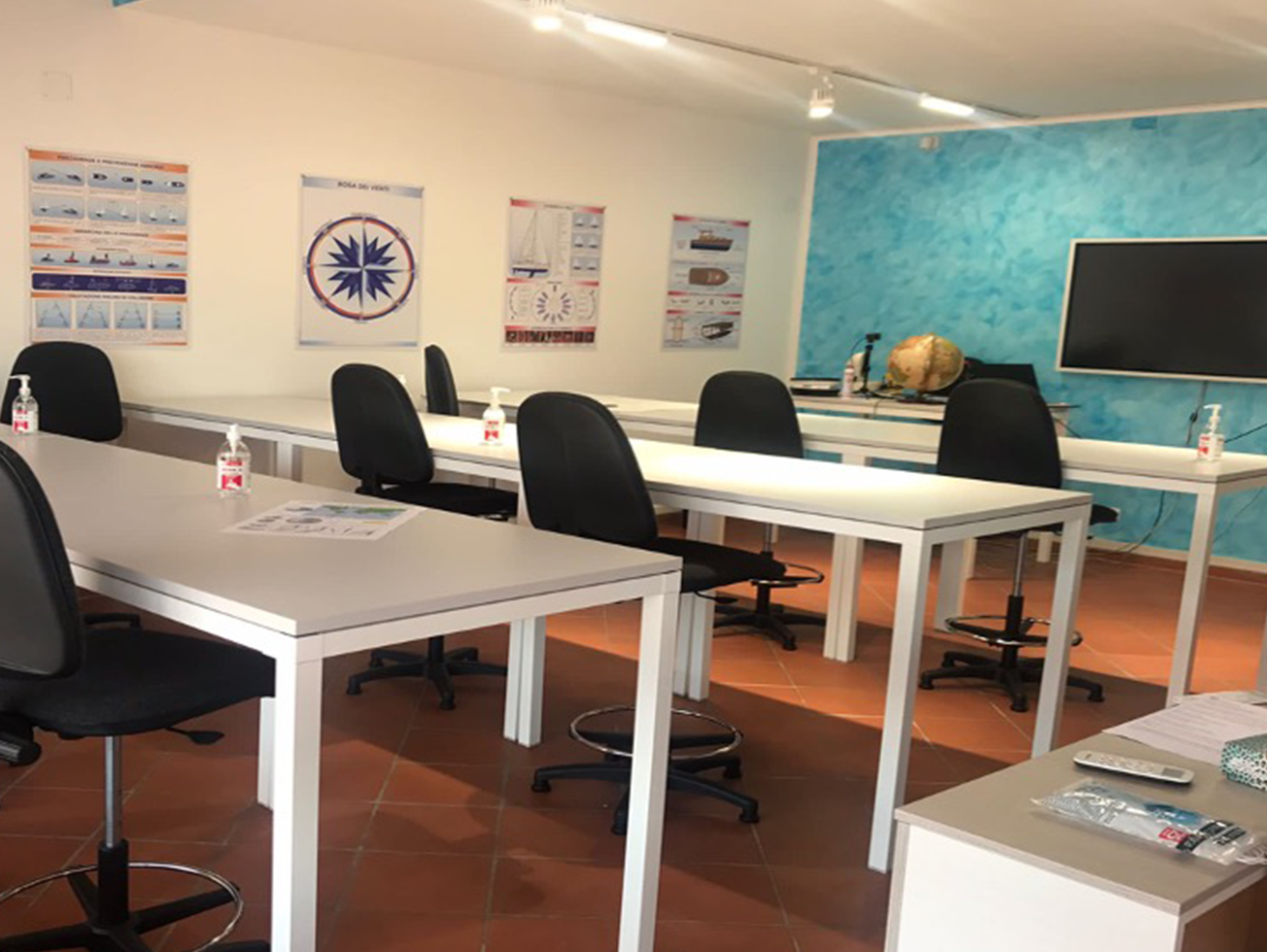 Aula di formazione indipendente dotata di dieci postazioni autonome con comodi tavoli destinati all’utilizzo di carte nautiche, aula tecnologica con lavagna di proiezioni di slide e video e tabelloni didattici di ausilio all’insegnamento.